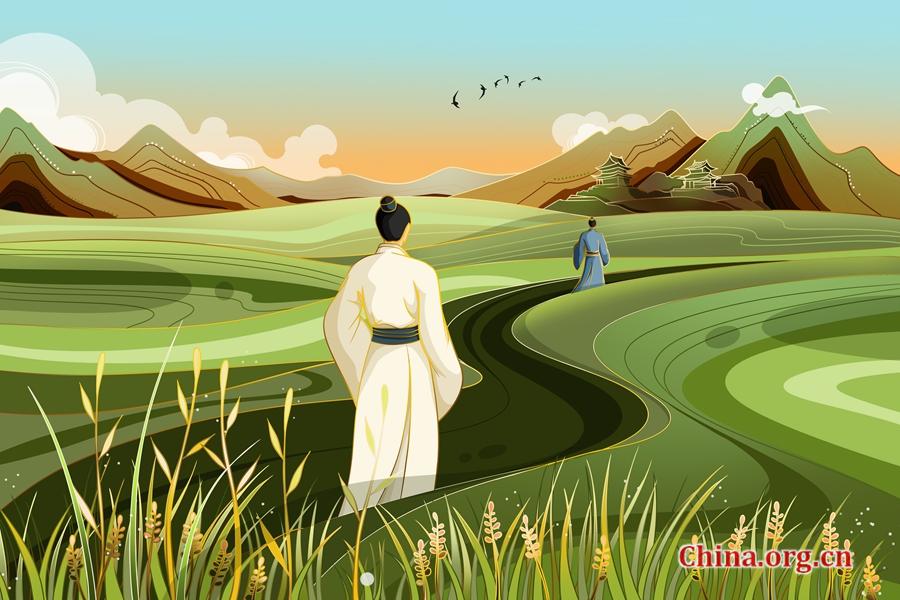 “离离”是青草茂盛的样子,吴先生模拟了原文的双声,译为Thick, thick, the grass on the plain。“一枯荣”,有枯萎的季节,也有繁茂的季节(season of growth and season of decay)。“野火烧不尽,春风吹又生”是千古名句,译为No prairie fire can destroy it root and all; For when the Spring wind blows, it grows again. 注意root and all的用法,这个短语搭配相当于root and branch,是完全、彻底的意思,对应原文中的“尽”字。“远芳”是从远处飘来的草香,译为its fresh smell, wafted from afar。waft的字典解释是to move, or make something move, gently through the air,用在此处,非常恰当。“晴翠”说的是草的碧绿的颜色,吴先生用bright emerald(明丽的绿宝石的色彩)来翻译,让人眼前一亮。“又送王孙去”中的“王孙”,就是我们口头上常说的公子王孙,也就是贵族的后代。称对方为“王孙”,是尊敬、客气的说法,实际上就是友人。吴先生没有把“王孙”译成descendants of ancient kings或者grandsons of nobility,而是别出心裁,译成了genie of Spring(春天的精灵),也可引申为春之娇子。白居易写这首诗时,只有十四五岁,所以,吴先生想象他送别的朋友应该是青春洋溢、意气风发的同学少年,故用genie of Spring来翻译“王孙”,让整首诗都灵动活泼起来。