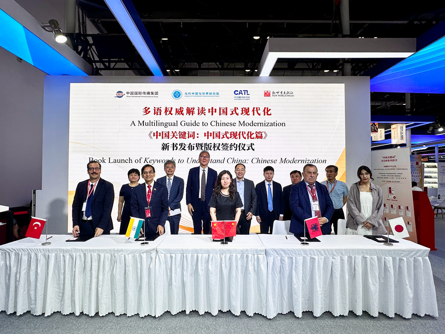 发布时间:2025-06-23 09:40:49 | 来源:当代中国与世界研究院 | 作者: | 责任编辑:郑成琼2025年6月18日,由当代中国与世界研究院联合新世界出版社共同主办的《中国关键词:中国式现代化篇》新书发布暨版权签约仪式在第31届北京国际图书博览会举行。本次活动以“多语权威解读中国式现代化”为主题,对外发布了“中国关键词”多语种系列图书的最新成果——《中国关键词:中国式现代化篇》15个语种的中外对照版图书,并实现了土耳其文版、阿尔巴尼亚文版、日文版、印地文版的国际合作出版签约。